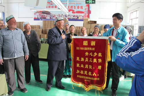 库尔班大叔送上锦旗后,深情地紧握周长胜的双手,激动地说:“今年年初,村里30个孩子通过参加公司举办的双语和纺织服装岗前培训,都掌握了一技之长,从农民转变为了合格的产业工人。现在孩子们每个月工资平均都在3000元左右,我们村民的日子是越来越好了。”
